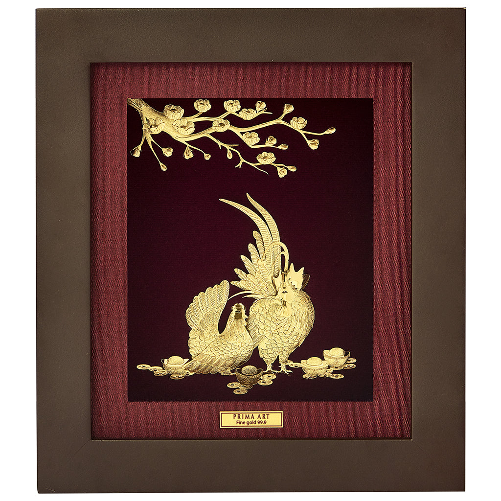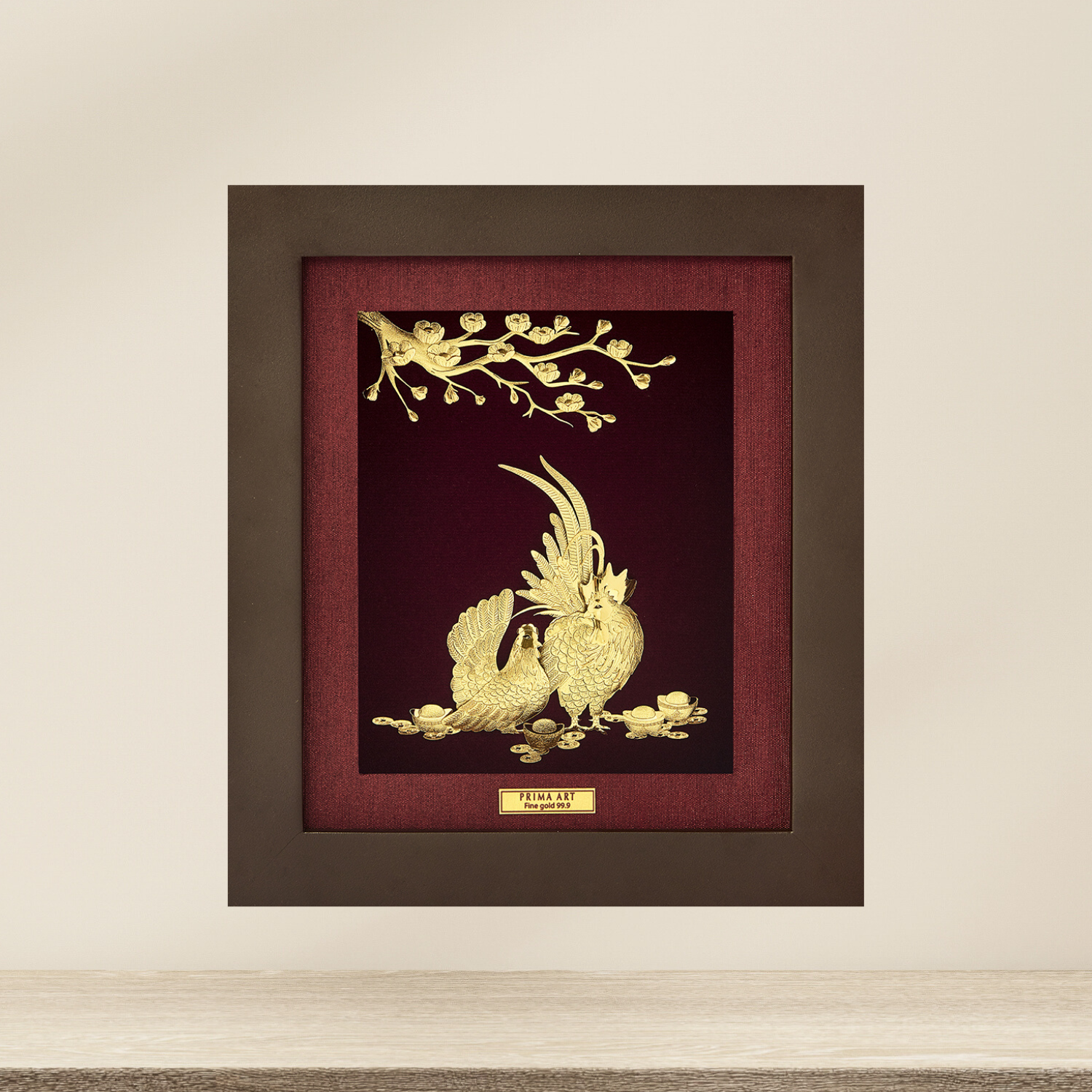 Golden Rooster Welcoming Spring depicts a pair of roosters nestled together under vibrant apricot blossoms, embodying love, unity, and joy. This piece captures the warmth of family and harmony, bringing an aura of happiness and the promise of a fulfilling, prosperous life to any space.